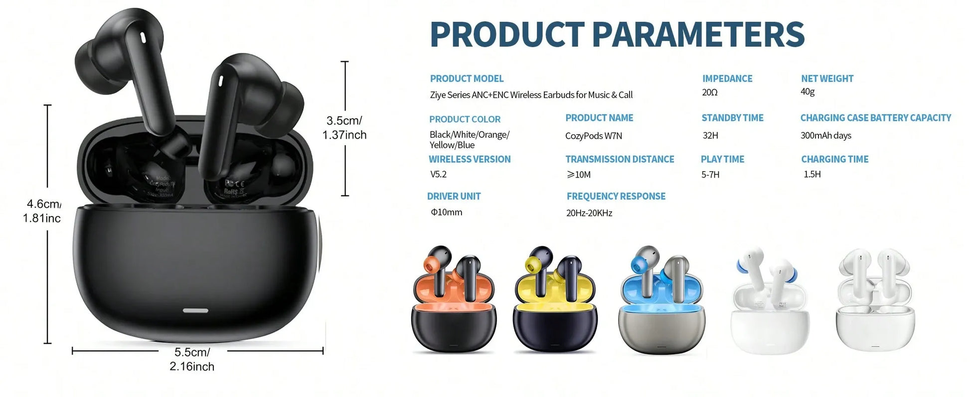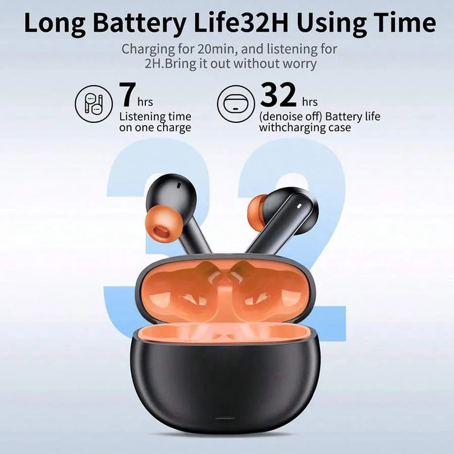 These wireless earbuds offer Bluetooth 5.2 connectivity for a fast and stable connection with your devices. The stereo sound quality enhances your listening experience with clear, rich audio. Equipped with noise-cancelling microphones, they help reduce background noise during calls, ensuring crystal-clear conversations. The earbuds provide up to 32 hours of playback time with the portable USB charging case, making them ideal for long listening sessions or travel. Available in multiple colors, they are stylish and suitable for everyday use.![]()